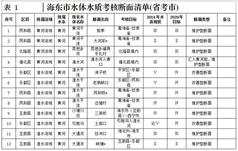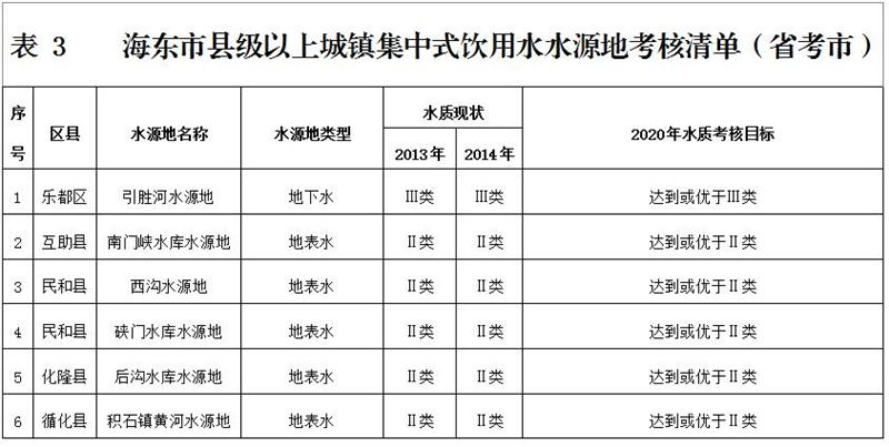 主要指标:到2020年,黄河干流大河家出境断面水质持续保持在Ⅱ类以上,湟水干流民和桥出境断面水质稳定达到Ⅳ类并向好发展,力争Ⅲ类水质比例达到50%,大通河峡塘出境断面水质持续保持在Ⅱ类以上;乐都区集中式饮用水水源水质达到或优于Ⅲ类的比例达到100%,县级以上城市集中式饮用水水源水质达到或优于Ⅲ类的比例总体达到95%。