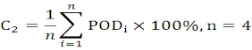 (2)灾害性天气预警准确率C2。通过统计灾害性天气预报预警准确率,评估灾害性天气预警准确率的提高程度。灾害性天气预警准确率按照《青海省气象灾害预警信号质量检验办法(试行)》(青气预函〔2015〕9号)的分类,在事件型灾害性天气─大风、冰雹、暴雨、暴雪4个类别进行评定。计算公式为: