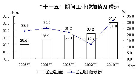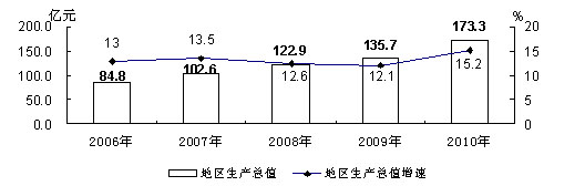 完成地区生产总值173.31亿元,按可比价计算,同比增长15.2%,比去年同期提高3.1个百分点,增幅创历史新高。其中第一产业完成增加值35.83亿元,同比增长6.6%,拉动GDP增长1.04个百分点,对GDP增长的贡献率为6.84%;第二产业完成增加值67.37亿元,同比增长27.2%,拉动GDP增长10.47个百分点,对GDP增长的贡献率为68.86%;第三产业完成增加值70.11亿元,同比增长8.1%,拉动GDP增长3.7个百分点,对GDP增长的贡献率为24.3%。
