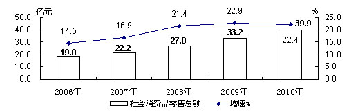 "十一五"期间全区社会消费品零售总额及增速
