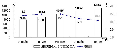 "十一五"全区城镇居民人均可支配收入及增速