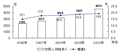 农民人均纯收入4574元,比上年增长19.53%。其中:人均工资性收入2328元,增长28.46%;人均家庭经营收入1601元,增长 14.47%;人均转移和财产性收入644元,增长5.4%。农牧民人均生活消费支出3209元,比上年增长13.83%,恩格尔系数为38.34%。农牧民人均居住面积24平方米。