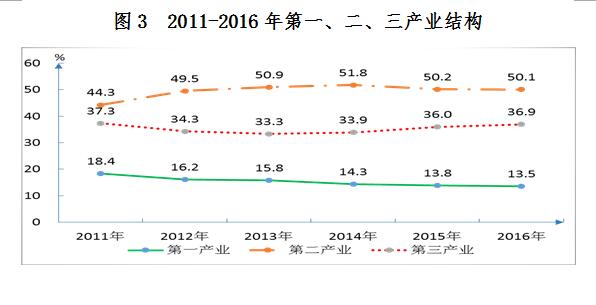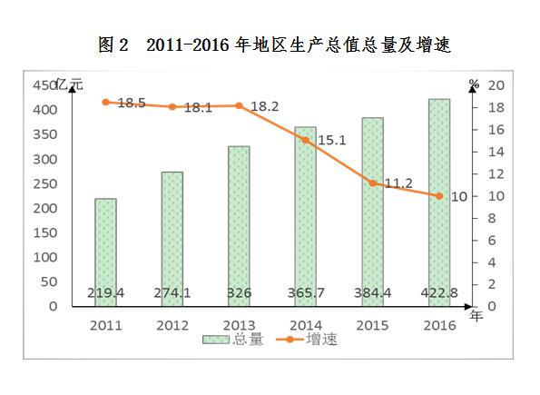 初步核算,全年全市地区生产总值422.8亿元,按可比价格计算,比上年增长10%。分产业看,第一产业增加值54.97亿元,增长5.5%;第二产业增加值211.98亿元,增长11.6%;第三产业增加值155.85亿元,增长9.5%。第一产业增加值占全省地区生产总值的比重为13%,第二产业增加值比重为50.1%,第三产业增加值比重为36.9%。人均地区生产总值28998.5元,比上年增长9.27%。