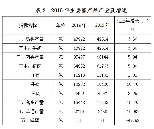 年末草食畜存栏总数183.9万头(只),比上年增长6.13%,其中:大牲畜存栏32.96万头,比上年增长3.39%;羊存栏150.94万只,比上年增长6.75%;猪存栏78.54万头,比上年增长16.3%;家禽存栏156.08万只,比上年增长2.17%;兔存栏21.99万只,比上年下降0.95%。全年草食畜出栏总数83.95万头(只),比上年增长5.08%,其中:大牲畜出栏11.53万头,比上年增长3.04%;羊出栏72.95万只,比上年增长6.19%;猪出栏92.79万头,比上年增长13.21%;家禽出栏226.86万只,比上年下降0.7%;兔出栏39.89万只,比上年下降51.35%。在畜产品产量中:肉类总产量9.55万吨,比上年增长5.94%;奶类产量4.39万吨,比上年增长3.36%;羊毛产量0.27万吨,比上年增长10.98%;禽蛋产量1.34万吨,比上年增长15.7%。