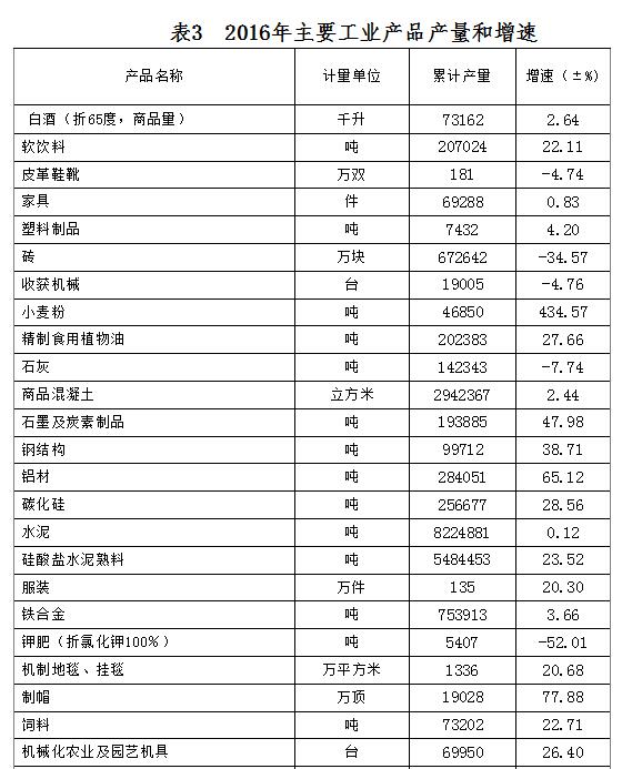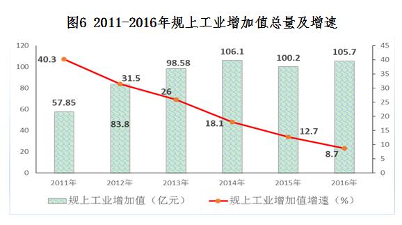 2016年全部工业实现增加值142.48亿元,比上年增长9.43%,工业产销率92.91%,比上年提升1.11个百分点。其中,规模以上工业实现增加值105.7亿元,增长8.7%,产销率92.34%,比上年提升1.74个百分点;规模以下工业实现增加值36.78亿元,增长11.56%。规模以上工业企业亏损企业33家,比上年同期减少7家。规模以上工业主营业务收入255.8亿元,比上年增长12%,比上年同期提升6.7个百分点;人均主营业务收入121.8万元,比上年同期增加1.6万元。园区工业增加值比上年增长10.8%。年底全市在库规模以上工业企业111家,比上年增加11家。