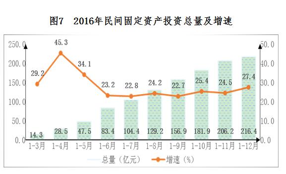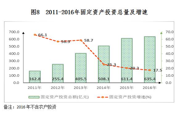 2016年,全市共完成总投资635.43亿元,比上年增长17.53%。其中:一产完成投资38.87亿元,增长1.81%;二产完成投资140.34亿元,下降26.21%;三产完成投资456.22亿元,增长46.08%。工业投资126.75亿元,下降12.47%,一般性工业投资103.97亿元,下降10%,循环经济、新兴产业投资占一般性工业投资的70%。按报送渠道划分:项目投资574.5亿元,增长15.53%。房地产投资60.9亿元,增长40.42%。按投资构成划分:建筑、安装工程完成投资555.15亿元,增长18.3%;设备、工具、器具购置60.14亿元,增长62.85%;其他费用20.14亿元,下降41.57%。民间投资216.4亿元,增长27.24%,占总投资的34.05%。
