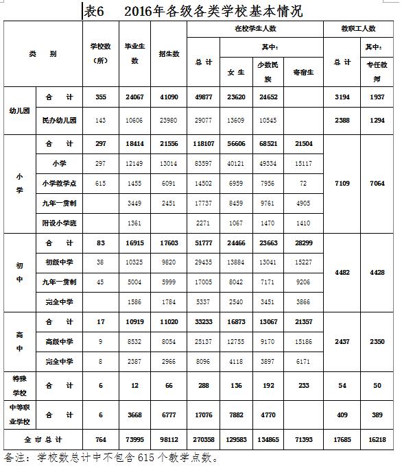全市各类学校764所,在校学生27.04万人。其中:普通中学100所,在校学生8.5万人;职业中学6所,在校学生1.7万人;小学297所,在校学生11.81万人;特殊教育学校6所,在校学生288人;幼儿园346所,在园幼儿4.99万人。全市学前教育三年毛入园率80%,比上年提高3.2个百分点;小学入学率99.97%,比上年提高0.03个百分点;初中入学率98.82%,比上年提高0.4个百分点;九年义务教育阶段巩固率93.56%,比上年提高0.53个百分点;高中阶段毛入学率89.44%,比上年提高8.94个百分点。