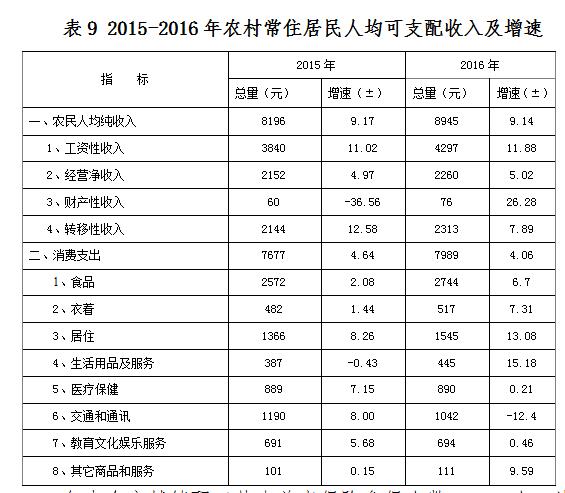 全年全市农村常住居民可支配收入8944.9元,增长9.1%。其中:工资性收入4296.7元,增长11.9%:经营净收入2259.9元,增长5%;财产净收入75.7元,增长26.3%;转移净收入2313元,增长7.9%。